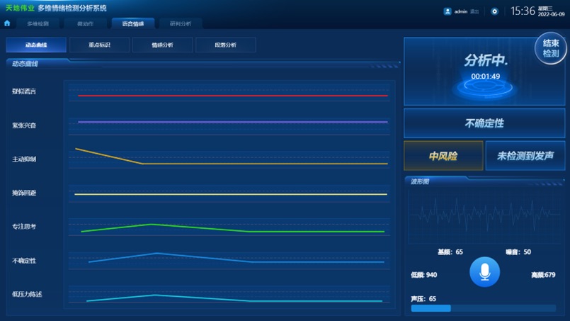 天地偉業(yè)多維情感檢測(cè)分析系統(tǒng)并非四大功能的簡(jiǎn)單疊加,而是通過(guò)心理狀態(tài)與壓力值綜合分析,實(shí)現(xiàn)“1+1>2”的研判效果,可更精準(zhǔn)判斷對(duì)象處于“抗拒+高壓力”狀態(tài),為工作人員提供明確的研判方向,為留置、監(jiān)管、看護(hù)等場(chǎng)景提供了更精準(zhǔn)、更智能的監(jiān)測(cè)方案。